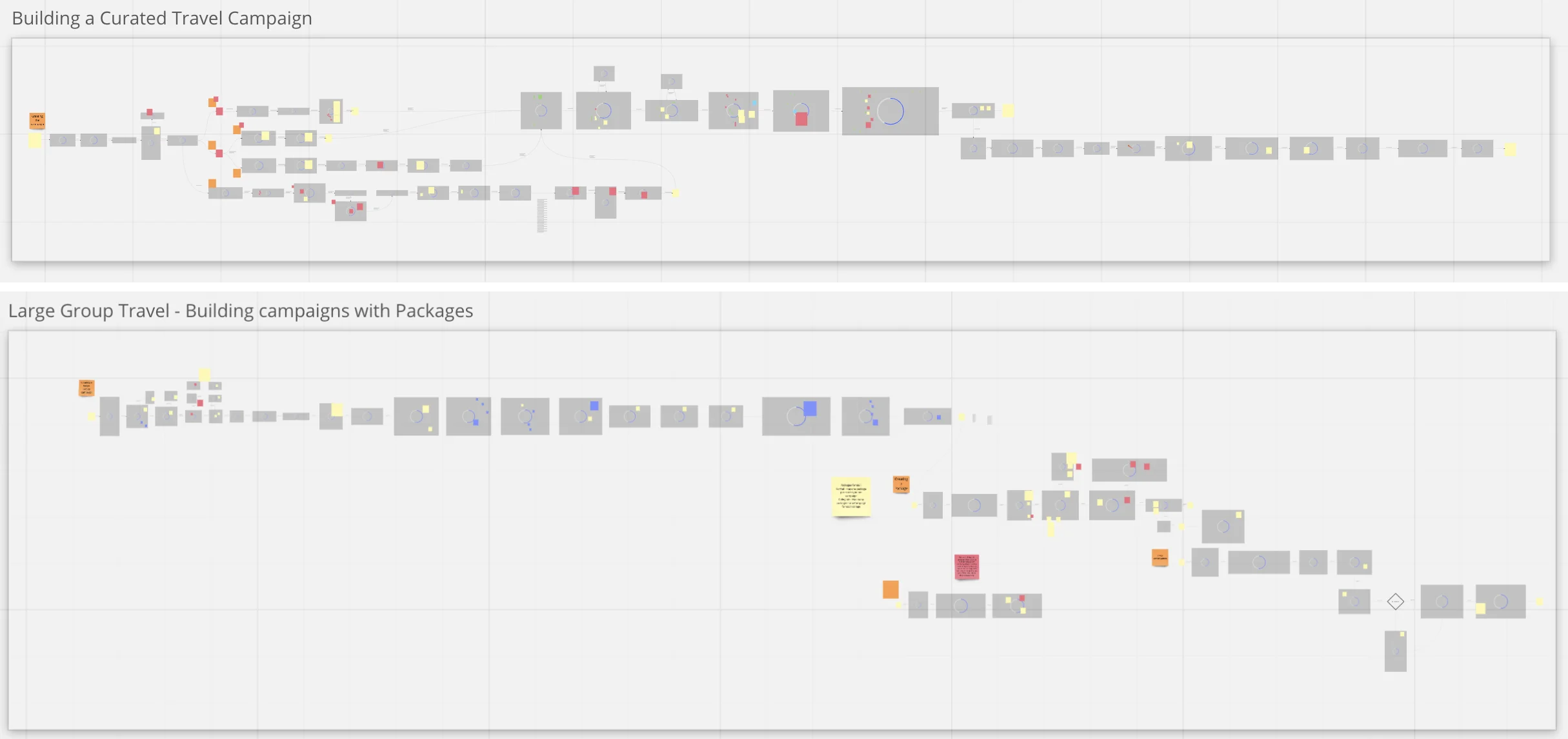 This is a big project so can't be implemented in one go so each section of the master flow got broken into bits and then side loaded. This required coordination with multiple teams which owned different parts of the flow. Main flow on the left and on the right, is the broken up pieces assigned to each team.